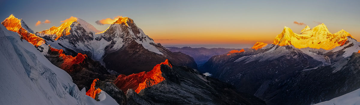 Vista de las montaña - Tres Picos Perú - Urus (5.495 m), Ishinca (5.530 m) y Tocllaraju (6.034 m). Escalada al Ishinca (5.530 m), travesia trekking en Quebrada Ishinca, es un receptivo popular para los escaladores que quieren quieren llegar a un 5mil o 6mil, pero debido a la belleza escénica, incluso sin pico de escalada muy interesante.